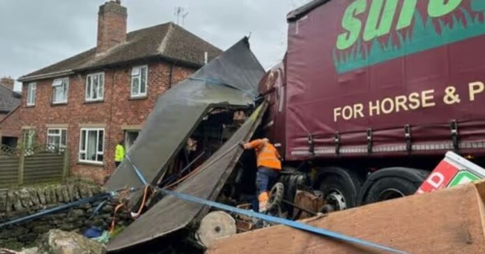 Reports indicate that the collision occurred around 5:50 am, resulting in the truck crashing through a dry stone wall, damaging the property’s front garden and a shed, but narrowly missing the house itself. Emergency services, including an ambulance, responded to the scene. South Yorkshire Police confirmed the incident, stating that no serious injuries were reported, but the driver was taken to the hospital as a precaution.