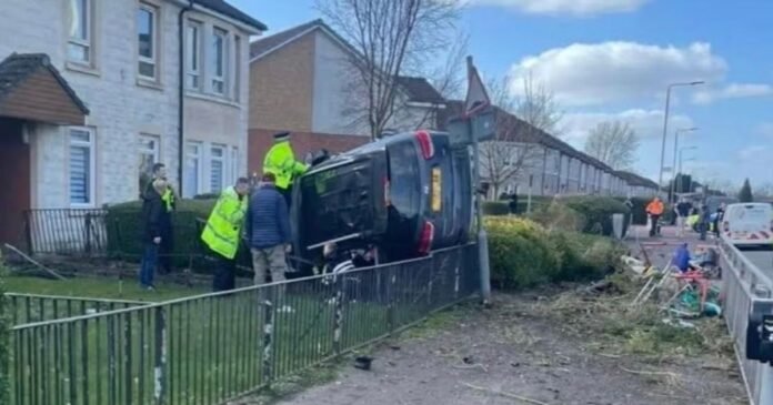 A car crash incident in Glasgow’s Drumoyne area has left a vehicle overturned and resting on its side in a residential front yard. Emergency services are currently on the scene on Shieldhall Road responding to the incident. Pictures from the site depict the car lying sideways after flipping over during the collision, with uncertainty about any potential injuries.